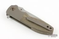 This Lambert TAD Gear Dauntless Linerlock Folder has a hand rub satin finished blade with swedge, flipper and notched thumb ramp. The handle has blasted titanium bolsters liners and tip up clip, green linen micarta scales and backspacer, anodized titanium pivot collars. Nice detent, lockup and blade seating. Comes with a signed zippered case. Excellent condition.
