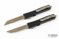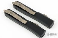 These two Ultratech OTF automatics by Microtech both feature bronzed stonewashed blades. Death Card stylized aluminum contoured frame with apocalyptic finished hardware and tip down stainless steel clip.  One knife has a Hellhound blade and one knife has a Warhound blade.  Includes original box and papers both serialized 099 dated 02/23.  Excellent condition.