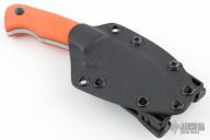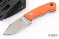 This PSK (Personal Survival Knife) by Tom Krein features a satin finished blade with swedge and notched thumbrest, .169" blade stock and 1.114" blade depth, full tang construction. The handle has orange G-10 scales with black liners and aluminum pin and lanyard tube. Includes a kydex sheath with TekLok. Has a few light sheath scratches, otherwise excellent condition. Dated 2011