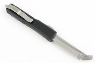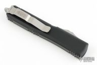 This Ultratech OTF automatic by Microtech features a stonewash finished tanto blade with a fully serrated edge and satin finished flats. Black contoured frame with a tip down stainless steel clip. Dated 08/2021. Serial Number 209644.  Comes with original box and papers. Excellent condition.