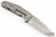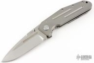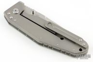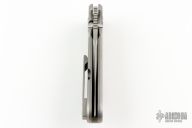 This Pocket Rocket by Shane Sibert features a satin finished spear point blade with notched thumbrest, fullers and dual thumbstuds. The handle has a bead blasted titanium frame with a canvas micarta backspacer with silver pin inlays, tip up or down reversible clip. Smooth action. Nice detent, lockup and blade seating. Outstanding work. Has a couple light scuffs, otherwise excellent condition.