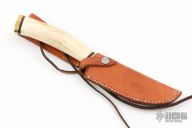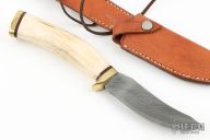 This knife by CDO features a Damascus blade with .155" blade stock and .989" blade depth, hidden tang construction. The handle has a brass guard and butt, stag grip with black/red spacers. Comes with a brown leather sheath. Excellent condition.