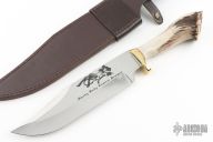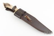 This Bowie by Shady Lady Custom Designs features a mirror polished blade with false top edge, .216" blade stock and 2.078" blade depth, hidden tang construction. The handle has a brass guard and crown stag grip with red/white spacers. Comes with a brown leather sheath. Excellent condition.