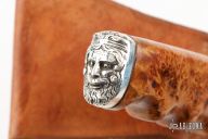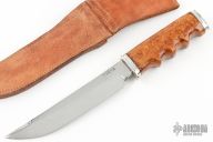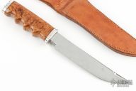 This Custom Sticker by Ruana knives features a satin finished blade with false top edge, .223" blade stock and 1.285" blade depth, hidden tang construction. The handle has a sterling silver guard and butt, Amboyna burl wood grip. Has "STERLING" on the guard top and "DES ENFANTS" on the bottom of the guard. Has "M" stamp on the blade. Comes with brown leather sheath. Has some light scratches and patina, otherwise excellent condition. Not sure if this handle was made by Ruana, or if it was added later.