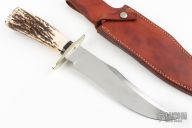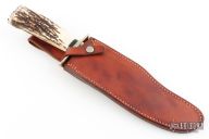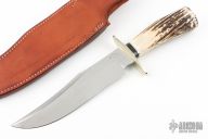 This JB Fighter by Enedino De Leon features a satin finish clip point blade with a sharpened top edge, .194" blade stock, 1.705" blade depth, hidden tang construction. The handle has a nickel silver guard, stag grip with black linen micarta and nickel silver spacers, nickel silver but plate. Excellent work. Comes in a brown leather sheath. Excellent condition.
