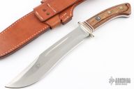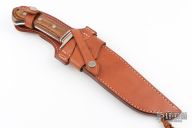 This Grizzly Bowie by Tak Blades features a satin finished, recurved bowie style blade with swedge and fullers, .257" blade stock and 1.772" blade depth, hidden/frame tang construction. The handle has a nickel silver guard with nickel silver and red and black fiber spacers, dymondwood scales with Grizzly Paw shield and nickel silver pins over full tang construction. Brass lanyard tube in pommel. Includes leather sheath with belt loop. Excellent condition.