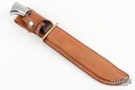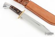 This knife is over 25 years old. Mirror polished bowie blade with fullers, .163" blade stock and 1.249" blade depth, full tang construction. The handle has a brass guard, wood handle with black/white/red spacers and an aluminum butt. Comes with a brown leather sheath. Blade stamped "WESTERN U.S.A.". Has some light oxidation spots, otherwise excellent condition.
