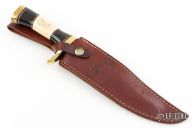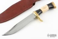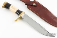 This knife by VOSS (please let us know if you know this makers full name) features a mirror polished blade with false top edge, .256" blade stock and 1.268" blade depth, hidden tang construction. The handle has a brass guard and butt with a buffalo horn and mammoth ivory grip with scrimshaw, black/white spacers. Comes with a brown leather sheath. Has some light scratches and patina, otherwise good condition.