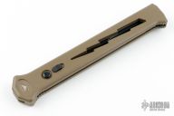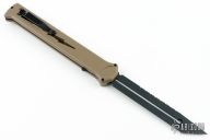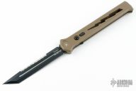 Joining the Estiletto OTF lineup is this fantastic model with a USA cutout on the brown anodized aluminum body with black hardware/clip and a black coated dagger blade with partially serrated top edge.