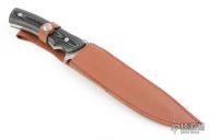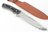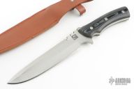 This knife (please let us know if you know who this maker is) features a satin finished blade with false top edge and notched thumbrest, .298" blade stock and 1.721" blade depth, full tang construction with black/white linen micarta scales. Comes with a brown leather sheath. Has a few light scratches, otherwise excellent condition.