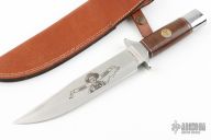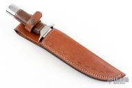 This bowie by Falkner features a satin finished blade with false top edge, .154" blade stock and 1.374" blade depth, hidden tang construction. The handle has a stainless steel guard and butt, stacked leather grip. Comes with a hand tooled brown leather sheath. Has a few light scratches, otherwise excellent condition.