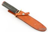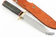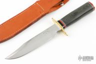 This BL Bowie by Enedino De Leon features a satin finish blade with a sharpened top edge, .198" blade stock and 1.290" blade depth, hidden tang construction. The handle has a brass guard and butt, black canvas micarta grip with black, red and white spacers. Includes a brown leather sheath. Excellent condition.
