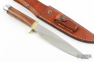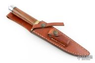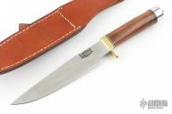 This Skinner by RBH Custom Knives features a satin finished blade with notched thumbrest, .167" blade stock and 1.392" blade depth, hidden tang construction. The handle has a brass guard, wood grip with red/brass spacers and a aluminum butt. Comes with a brown leather sheath. Has some scratches, otherwise excellent condition.