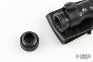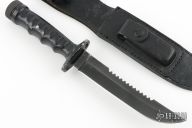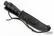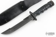 This survival knife by Parker-Imai features a black finished blade with sawteeth on the spine, .171" blade stock and 1.189" blade depth, black coated aluminum hollow handle with a knurled black steel removable butt cap. Comes with a black leather sheath. Has some light scratches and some wear on the handle finish, otherwise good condition.