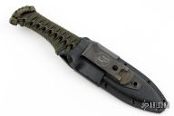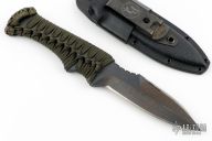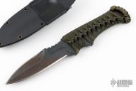 This Hammer Shark by Tracker Dan features a black finished blade with .226" blade stock and .992" blade depth sharpened top edge. The handle has a double ridge cord wrap with tapered tang and shroom cap at the tail. Comes with a TD reversible kydex sheath with clip.  Has been resharpened, great condition.
