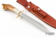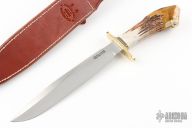 "The Model 1 by Randall Made Knives was made famous by Allied combat troops in World War II and has since been widely used in all theaters of war." This knife features a satin finished blade with a sharpened top edge, .204" blade stock and 1.185" blade depth, hidden tang construction. The handle has a brass guard, crown stag grip with black/brass spacers, and a carved face of "LUCY" on the butt by Paul G Gussenmeyer. Includes original brown leather sheath. Excellent condition. Has "Paul G. Grussenmeyer" on the blade.
