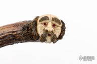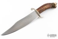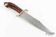 This Bowie by Master Smith James Batson features a hand rub satin finished blade with false top edge and visible temper line, .225" blade stock and 1.829" blade depth, hidden tang construction. The handle has a nickel silver guard, crown stag grip with "Mountain Man" carved face in the butt with red stone eyes. Has a couple very light scratches, otherwise excellent condition. The handle was carved by Paul G Gussenmeyer.