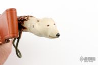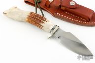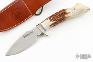 The Model 11 is the original drop-point blade. Designed by Tommy Thompson, noted Alaskan guide, in 1952 for big-game skinning, with point dropped below top of blade to prevent cutting too deeply through skins when used point first. The blade is satin finished with .166" blade stock and 1.324" blade depth, hidden tang construction. The handle has a nickel silver guard, "Polar Bear" carved stag handle with ruby cabochon painted eyes by Paul G Gussenmeyer, black/duralumin spacers. Comes with a brown leather sheath with sharpening stone. Excellent condition.