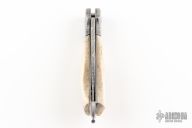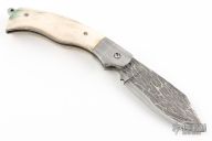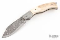This "Sea Skimmer" lockback by Thierry Le Senecal features a Mosaic Damascus blade with 100C6 steel cutting edge. The handle has mosaic Damascus dovetailed bolsters, raindeer horn scales, stainless steel liners and backspacer with lanyard hole. Has nice blade seating. Has a tiny about of vertical blade play and small gaps between the bolsters, and scales, otherwise excellent condition.