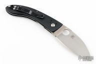 This Bob Lum Chinese folder by Spyderco has a satin blade and black aluminum handle with reversible SS clip and single SS liner. Comes with original box. Has some light scuffs on the clip, and some scuffs on the blade. Excellent condition.