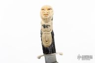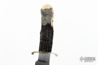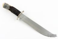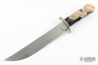 This Bowie by Master Smith James Batson features a hand rub satin finished blade with .220" blade stock and 1.647" blade depth, hidden tang construction. The handle has a nickel silver guard, India Sambar stag grip with "GOLIATH" carved butt by Paul G Grussenmeyer. Excellent condition. Comes with a zippered case.