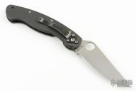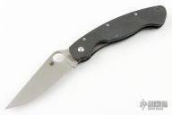 This Military Framelock by Spyderco has a satin finished blade with notched thumbrest and thumbhole. Handle is a carbon fiber frame with stainless inlaid lock bar, and stainless steel tip down clip, and lanyard tube. Comes with original box and papers. Has some scuffs, scratches, and junk in the crevasses. Good user condition otherwise.