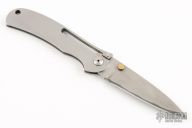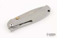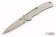 This original One-Handed Folder by A.G. Russell features a Cowry San Mai Damascus drop point blade with dual brass thumbstuds. The handle a integral stainless steel frame with lanyard hole on pommel. Has some scuffs and scratches, great condition otherwise.