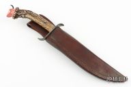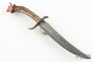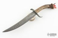 This knife by James Batson features a Damascus blade with false top edge, .206" blade stock and 1.233" blade depth, hidden tang construction. The handle has a Damascus guard, crown stag butt with nickel silver pin, the butt has been carved with a devil by Paul G Gussenmeyer. Excellent condition.