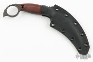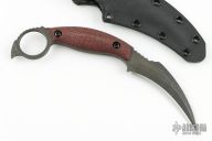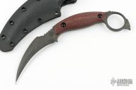 The re-desinged Bodyguard 2.0 karambit was originally designed for the purpose of an every day carry utility knife as well as one for self defense.  The blade is traditionally arched with the handle having a safety ring for one's finger to prevent the knife from sliding back through the user's hand while in use.  The added feature of the safety ring also ensures that the knife is always secure and in optimal position for use.  The re-design includes a choil for added protection.  Our design is double edged but can be made as a single edge to meet any state or country restirctions.  The handle now comes in a variety of materials and colors and allows for a non-slip grip.  The blade comes with a black Kydex retention sheath and belt attachment that is MOLLE compatible.