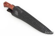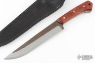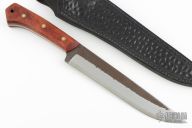 This knife by Muteki by Carter features a 410 stainless clad San Mai blade with a carbon steel core, .190" blade thickness and 1.717" blade depth, full tang construction. The handle has wood scales with brass/stainless pins. Comes with a hand tooled black leather sheath. Excellent condition.