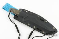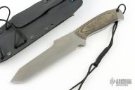 This A.T.A.K. by Farid Mehr features a bead blasted chisel ground blade with notched thumbrest, .249" blade stock and 1.857" blade depth, full tang construction. The handle has black canvas micarta scales with a lanyard hole at the butt. Comes with a kydex sheath. Has some light patina, otherwise excellent condition. Comes with a note from the maker as well. This knife was made over 33 years ago!