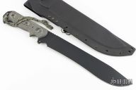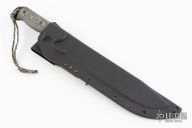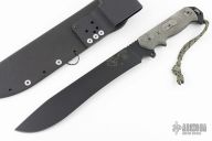 The Armageddon is a Trace Rinaldi design made by Tops. Black coated blade with notched thumbrest, .256" thickness and 1.870" blade depth, full tang construction. The handle has black linen micarta scales with white liners. Comes with hard plastic molded sheath. Excellent condition.