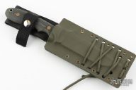 This knife by Newt Livesay features a black clip point blade with false top edge, .215" blade stock and 1.222" blade depth, full tang construction. The handle has black linen micarta scales. Comes with a kydex sheath with a belt clip. Has some light scratches, otherwise excellent condition.