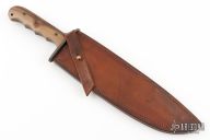 This knife by Ricky Fowler features a black blade with .192" blade stock and 1.976" blade depth, full tang construction. The handle has a black steel guard, wood scales and mosaic pins. Comes with a brown leather sheath. Has a couple light scuffs, otherwise excellent condition. #1689