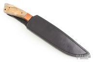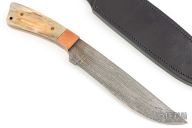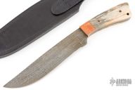 This Skinner from Ricky Fowler features a black finished blade with .189" blade stock and 1.614" blade depth, full tang construction. The handle has copper bolsters, mammoth ivory scales with mosaic pins and lanyard tube. Comes with a black leather belt sheath. Has a couple light scuffs and patina, has a light split in the handle material, great condition otherwise.