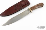 This Bowie by Master Smith John Fitch features a flat ground blade with a hand rubbed satin finish and sharpened clip, .223" blade stock and 1.629" blade depth, hidden tang construction. The handle has a brass guard, curly maple grip. Comes with a beautiful hand tooled brown leather sheath by Rowe's Leather. Comes with a zippered case. Has some rust, otherwise good user condition.