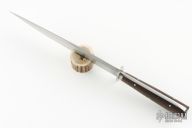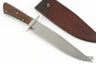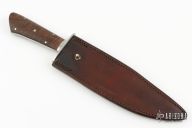 This Bowie by Journeyman Smith Sam Butler features a hand rub satin finished blade with false top edge, .232" blade stock and 1.707" blade depth, hidden/frame tang construction. The handle has a satin finished stainless steel guard and frame with curly wood scales. Comes with a brown leather sheath with belt loop. Has some light oxidation, otherwise good condition.