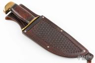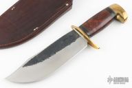 This Bowie by James Behring features a clip point blade with hammer marked flats and satin finished grinds, .243" blade stock and 2.387" blade depth, hidden tang construction. The handle has a brass guard and butt, desert ironwood burl grip with black/brass/leather spacers. Comes with a hand tooled brown leather sheath by Rowe's Leather. Excellent condition.