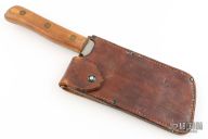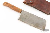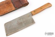 This vintage cleaver by Craftsman features a large blade with .178" blade stock and 3.496" blade depth, full tang construction. The handle has wood scales with brass pins. Has been used, has scratches and patina, has oxidation, otherwise good condition for its age. Comes with a brown leather sheath.