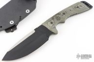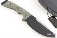 This Outpost Command from TOPS Knives features a black coated clip point blade with swedge and notched thumbrest, .253" blade stock and 1.936" blade depth, full tang construction. The handle is comprised of green linen micarta scales over red liners . Exposed tang pommel features multiple lanyard hles. Includes kydex sheath with belt clip. Has a couple light scuffs, excellent condition otherwise.