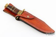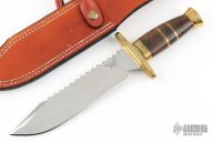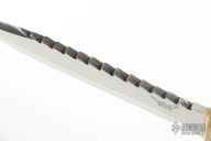 This knife by John Nelson Cooper features a satin finished blade with a false top edge and sawteeth, .237" blade stock and 1.721" blade depth, hidden tang construction. The handle has a brass guard and butt, brown canvas micarta grip with brass spacers. Has some scratches, otherwise excellent condition. Comes with a brown leather sheath.