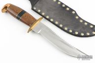 This knife by John Nelson Cooper features a satin finished blade with a false top edge and sawteeth, .180" blade stock and 1.605" blade depth, hidden tang construction. The handle has a brass guard and butt, brown canvas micarta grip with brass spacers. Has some scratches, otherwise excellent condition. Comes with a brown leather sheath.