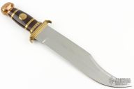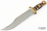 This Iron Mistress Bowie by John Nelson Cooper features a satin finished clip point blade with false top edge, .209" blade stock and 2.397" blade depth, hidden tang construction. The handle has a brass guard, brown canvas micarta grip with brass spacers and escutcheon and a fileworked brass butt cap. Has some light scratches and patina, otherwise excellent condition for its age.