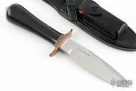 This was the first club knife made for the Randall Knife Society and was first offered in 1991. Marked "RKSA 678/994" on back of blade. Has a satin finished spear point blade with sharpened top edge, .219" blade stock and 1.153" blade depth, hidden tang construction. The handle has a brass double guard and butt, black linen micarta grip with black and brass spacers. Comes with a black leather sheath. Excellent condition.
