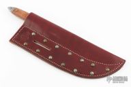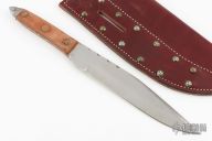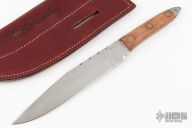 This throwing knife by Dan Dennehy features a satin finished unsharpened edges, .174" blade stock and 1.445" blade depth, full tang construction with leather scales. This knife has a few light scratches, otherwise excellent condition. Comes with original brown leather sheath.