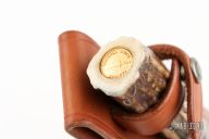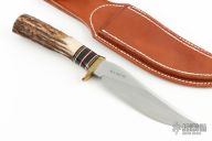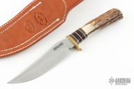 The Model 27 is an ideal all-around heavy-duty sportsman's knife. This knife has a carbon steel blade, .208" blade stock and 1.313" blade depth, hidden tang construction. The handle has a brass guard, and stag grip with black, brass, red, white, black micarta, and duralumin spacers. Randall Knife Society medallion in pommel. Marked RKS 426/129 on "B" side of blade. Includes original brown leather sheath, original papers. Excellent condition.