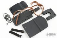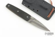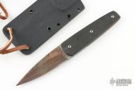 This Tanto from Bud Nealy features a Meier Steel Damascus blade with .123" blade stock and 1.023" blade depth. The handle is comprised of carbon fiber over full tang construction. Comes with kydex sheath and accessory. Numbered 474. Has rust on the blade and frame. Has some scuffs. Good condition otherwise.