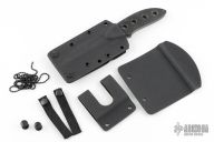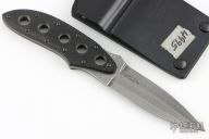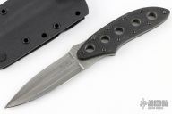 This fixed blade by Bud Nealy has a Meier Steel San Mai Damascus blade with a top edge and thumb ramp, .123" blade stock and 1.038" blade depth, full tang construction. The handle has textured black G-10 scales. #4995. Includes kydex sheath with removable belt clip and all the extra attachments and hardware. Excellent condition.