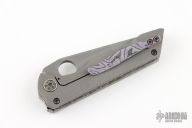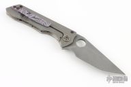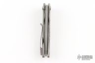 This Custom Mini Goblin by Gavko Knives features a stonewash finished blade with textured spine and a thumbhole. The handle has a black timascus and blasted titanium frame with a black timascus tip up clip. Rides on bearings, nice detent, lockup and blade seating. Comes with a Velcro case. Excellent condition.