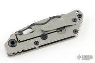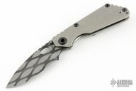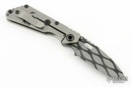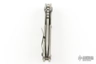 This Mick Strider Performance Series SNG CC framelock folder features a drop point blade with thumbhole and notched thumbrest, satin finished blade spine. The handle has a stonewashed titanium frame with titanium clip, tip up carry. Jimping on blade spine. Includes Hinderer "Lock Bar Stabilizer" for maximum reverse lock retention. Nice detent, lockup and blade seating. New condition.